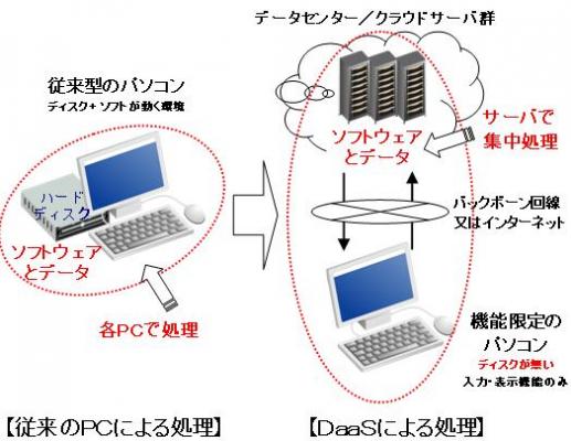 「DaaS」は“デスクトップ・アズ・ア・サービス”の略で、従来一台一台のPCにソフトウェアをインストールしてデータを処理していたものをサーバに集約し、通信回線を介して利用する方法です。見た目はほとんど変わりませんが、PCがディスク無しの「シンクライアント注1端末」となり省エネとなるほか、データをPCに保管しないため情報漏洩などのセキュリティリスクを抑える効果などが期待できます。
