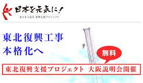 復興事業の「大阪説明会」への申し込みを多数お寄せ頂いております。ただし、「大阪説明会」は建設・建築事業者向けの説明会となっておりますので、それ以外の方は状況によってはお断りする場合がございます。ご了承下さい。