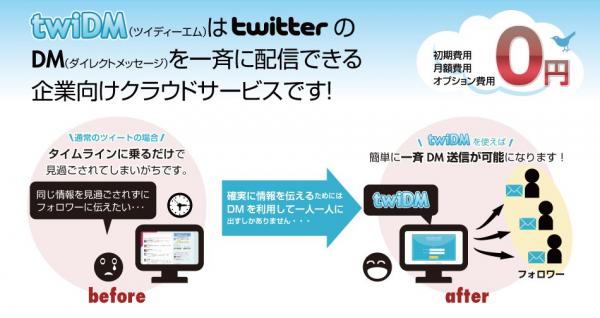 当社は今後も、twitterを活用したキャンペーンの運用支援をはじめ、震災時の連絡ツール等、企業とステークホルダーをつなぐダイレクトなコミュニケーションツールとして、「twiDM」をご提供してまいります。