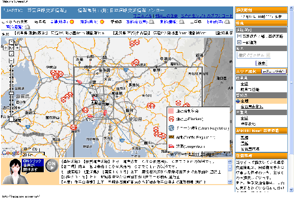インターネットの地図上に、5分毎に更新される「規制情報」と「交通渋滞」二種類の道路交通情報を事象ごとのアイコンで表示し、音声合成「AITalk(R)」で音声情報としても提供をいたします。