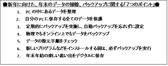 物理環境、仮想環境、クラウド環境に対応した使いやすいバックアップと復元のソリューションを提供するリーディングカンパニーであるアクロニス社(本社:米国マサチューセッツ州/日本:東京都港区、代表取締役 村上 督、以下: アクロニス)は、新年に向けた年末の大掃除として、お部屋やオフィスだけではなく、大切なデータを保管しているPCのデータに関しても整理整頓し、バックアップするための「7つのポイント」を提案します。