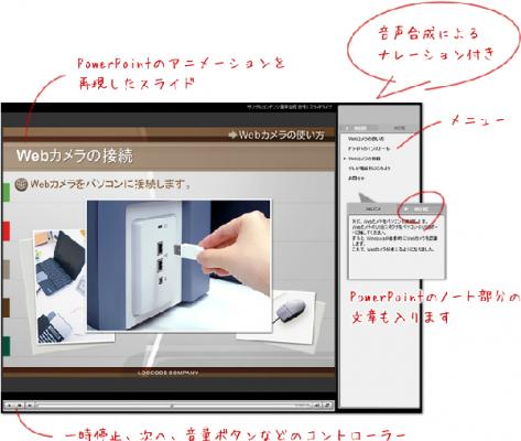 このようなプレゼン型コンテンツを作成するには、(1)作成ソフトを使い自身で作成する、(2)作成作業を外部に委託する、の二つの方法があります。