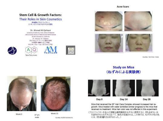 これによると、Dr.アーメッド・アルカタニ医学博士が実際に医科大学病院における研究と治療に、先進的なグロースファクター(=細胞成長因子)技術を応用し、障害を受けた患者の皮膚の修復治療や、人工皮膚培養の臨床応用を行なってきた実績と、これまで培ってきた彼のバイオテクノロジー研究、および臨床技術の応用によって得られた、医学的に出来うる限り高品質のGF(グロースファクター)を使用した医療及び化粧品において、老化した皮膚状態の改善、頭髪の再生と育毛を、これまでに見ることが出来なかったような速さと、即効性をもって実現させた結果が記されている。