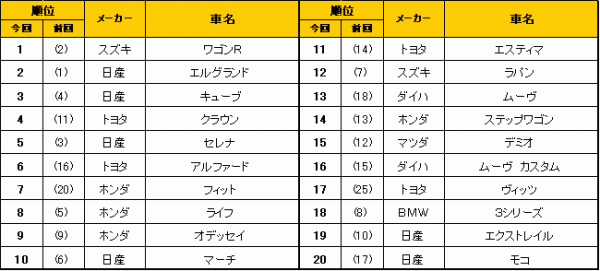 11月のランキングでは、安定して 1位にランクインしていた日産エルグランドと入れ替わる形で、スズキワゴンRが初の首位を獲得し、3位には日産キューブがランクイン。また、ミニバンのトップ20入りが増えてきました。これからの冬のシーズンに向けて、12月はミニバンやSUV・クロカン系車種の人気は上昇傾向となるでしょうか。