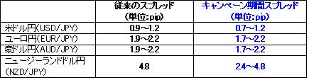 また当社では、米ドル円なら0.7~1.2pipなど、今年(2011年)末までの期間限定で、パートナーズFXの米ドル円、ユーロ円、豪ドル円のスプレッドを、ナロー提示するキャンペーンを実施中です。さらに今回のリリースに合わせ、年末年始特別企画としてニュージーランドドル円につきましても、以下のとおりスプレッドのナロー(狭小)化を実施いたします(2011年12月28日(水)~2012年1月16日(月)営業日終了までの期間限定)。