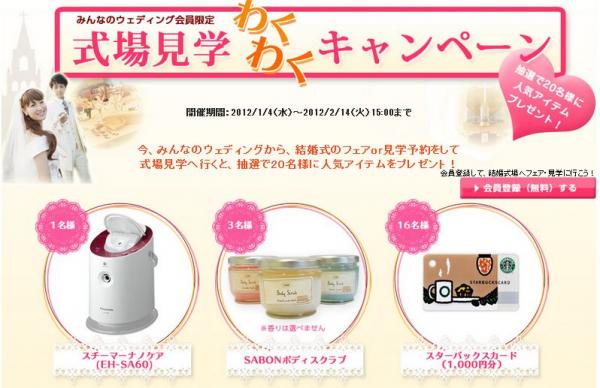 みんなのウェディングに登録されている方で、キャンペーン期間中にみんなのウェディングの「フェア予約」、「見学予約」フォームから、3件以上フェア予約または見学予約をし、式場見学された方の中から抽選で20名様に下記商品をプレゼントいたします。