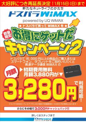 「ドスパラWiMAX」のキャンペーンで皆様に好評をいただいた『ドスパラで買ってWiMAXをお得にゲットだキャンペーン2』の実施期間を、2012年1月15日(日)まで再延長いたします。