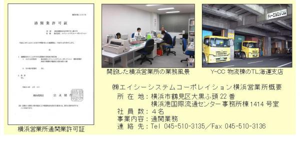 輸出入貨物の通関を専業とするACシステムは、東京、大阪の都心部のほか成田、羽田、関西の各国際空港に拠点を設け通関サービスをご提供しております。開設した横浜営業所は、ACシステムとして初めての横浜税関管轄の海上国際輸送通関拠点となります。