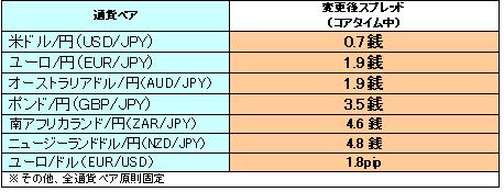 注:コアタイムにおいて通常時は上記スプレッドで固定しておりますが、早朝等の流動性が低い時、経済指標発表時等におきましてはスプレッドが広がる場合があります。