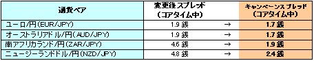 なお、これに併せたキャンペーンとして、一部の人気通貨ペアにおきましては上の表に記載いたしました提示スプレッドよりも更にナロー化いたします。
