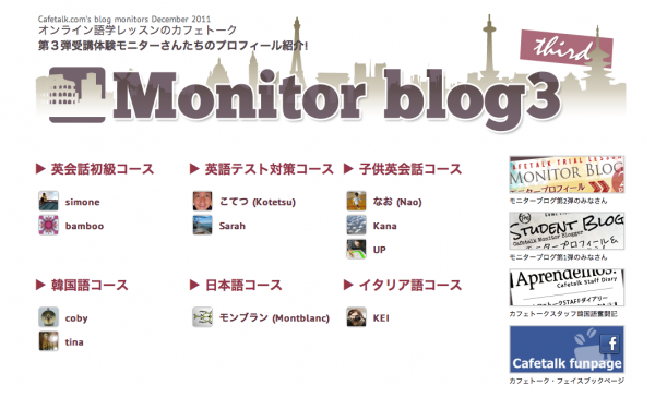 受講体験モニターブログは、スカイプを使ったオンライン語学学習を検討している一般の方々をはじめ、日頃マンツーマンレッスンで学習をしている既存のオンライン学習者の方々からも、「刺激になる」、「モチベーションアップにつながる」など、ご好評をいただいております。