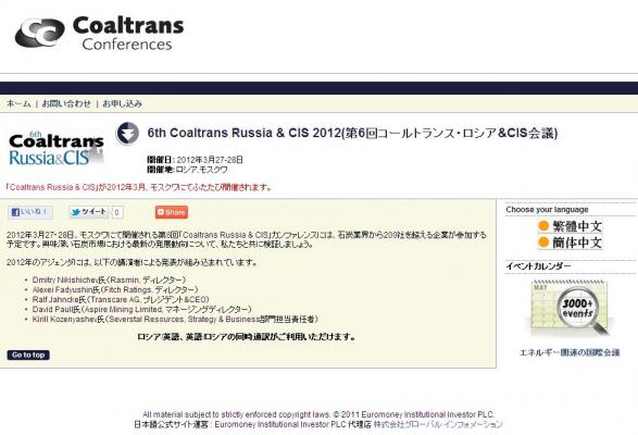 会議:「6th Coaltrans Russia & CIS 2012 (第6回コールトランス・ロシア&CIS会議)」