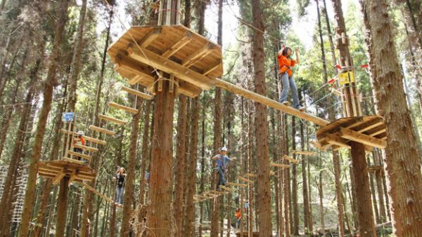 ▼(写真=)フルーツランド中村農園(上)と、下は樹の上をめぐって冒険する人気の「ターザニア」