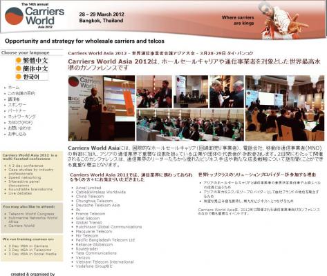 株式会社グローバル インフォメーションでは、皆様の利便性を図る為に、日本語、韓国語、中国語で「Carriers World Asia 2012 (世界通信事業者会議アジア大会)」の情報を提供するとともに、会議の参加のお申し込みを承っております。