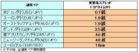 注:コアタイムにおいて通常時は上記スプレッドで固定しておりますが、早朝等の流動性が低い時、経済指標発表時等におきましてはスプレッドが広がる場合があります。