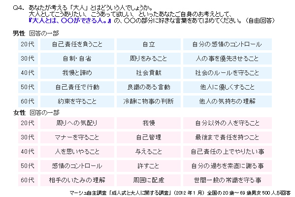 Q4.あなたが考える「大人」とはどういう人でしょうか。大人としてこうありたい、こうあって欲しい、といったあなたご自身のお考えとして、