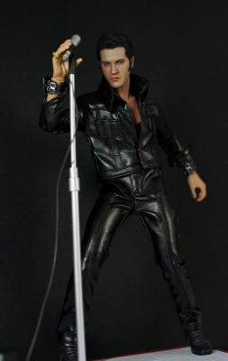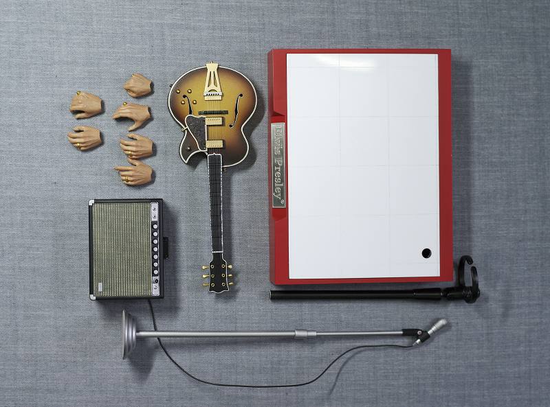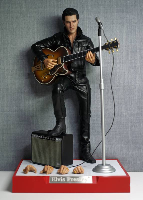 商品にはブラックレザースーツに身を包んだプレスリーと、使用していたエレクトリックギター、アンプ、マイクスタンド、取替え可能な手首パーツ3組といった豊富なアクセサリーが付属する超豪華仕様。フィギュアスタンド付き台座も当時のステージの色を再現しました。