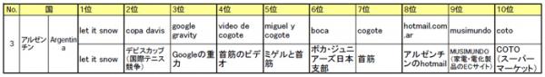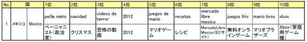 Google検索で世界30ヶ国において2011年12月に検索回数が急上昇したキーワードを選定し、今回は、メキシコ、ブラジル、アルゼンチンの3カ国と全体の分析を行いました。