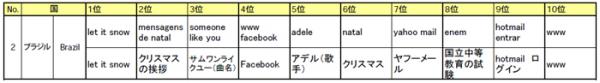 総評:季節に関するキーワード(クリスマス・2012)、ゲームに関するキーワード(マリオ、オンラインゲーム)などが急上昇しています。また、人名・人気Webサイトも急上昇しており、他国と同様の傾向となっています。