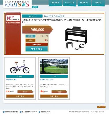 『リソポン』は、数年前より急速にマーケットが拡大してきたクーポン型の共同購入サイトであり、生活用品、食品等といった商品はもちろん、各種イベントのチケット、ホテルや旅館等の宿泊サービス、ゴルフ場、人間ドック等、多彩な商品やサービスをおおむね50%~70%引きの格安で提供、なかにはさらに割引率の高い目玉商品も出品予定しています。毎週木曜日に対象商品が新たに掲載され、翌月曜日には掲載終了となりますが、なかには掲出して短時間で売り切れてしまう数量限定の人気商品も出ています。