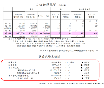 2012年1月1日に発表されました厚生労働省の「人口動態総覧」によりますと、2011年の婚姻数は、推計約67万組と見込まれ、前年と比較し3万組ほどの減少傾向にあることがわかります。