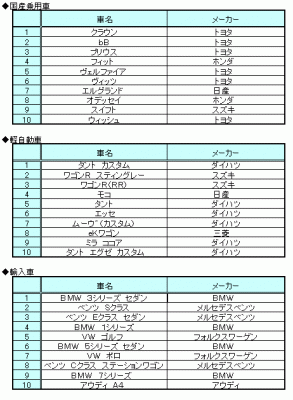 情報流通支援サービスの株式会社オークネット(本社:東京都千代田区/社長:藤崎清孝)は、2011年12月度のオークネットTVオークションにおける、成約台数を集計し、タイプ別ランキングベスト10をまとめました。