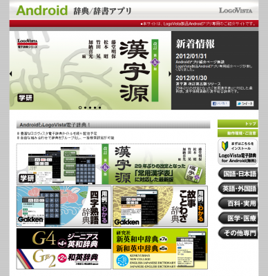 本サイトでは、これまでに発売した製品が[国語・日本語]や[英語・外国語]などカテゴリ別に紹介され、お探しのアプリが簡単に見つかります。また、各製品の紹介ページからはAndroid Marketへ直接飛べるリンクも設置。欲しいと思った製品にすぐ繋がります。