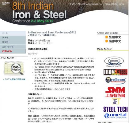 株式会社グローバル インフォメーションでは、皆様の利便性を図る為に、日本語、韓国語、中国語で「8th Annual Indian Iron and Steel Conference 2012 (第8回インド鉄鋼会議)」の情報を提供するとともに、会議の参加のお申し込みを承っております。