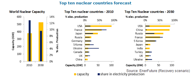 福島原発事故にもかかわらず、原子力は、特にロシアや急成長するアジア経済の電力需要の急速な成長を満たすだろう。2030年には、世界の原子力発電による発電量は「通常通り」のケースでは37%上昇し、発展しているアジアの総発電設備容量は2010年の1%に比べて25%にまで増加するだろう。