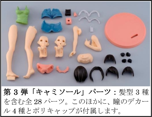 第3弾「キャミソール」パーツ:髪型3種を含む全28パーツ。このほかに、瞳のデカール4種とポリキャップが付属します。
