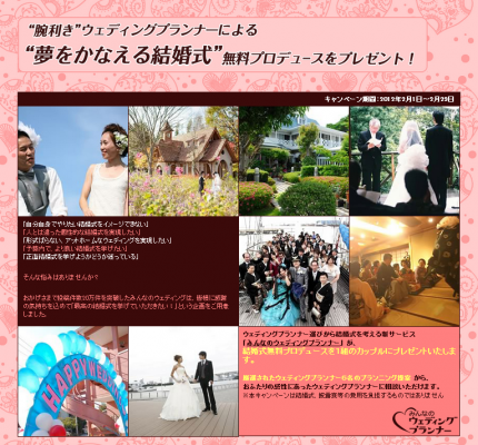 プランナー選びから結婚式を考える新サービス「みんなのウェディングプランナー」( http://mwpl.jp/ )を運営する株式会社みんなのウェディング(本社:東京都中央区、代表取締役:飯尾慶介)は、腕利きのウェディングプランナーによる「夢をかなえる結婚式」無料プロデュースを「みんなのウェディング」内にてプレゼントいたします。