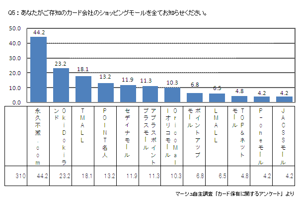 最も認知されているモールは「永久不滅.com」で44.2%、それ以外のモールはほとんどが1割前後である。