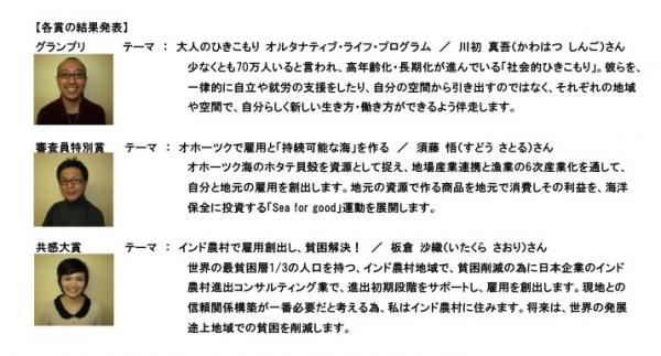 ◆各賞受賞者 http://socialvalue.jp/final/2012winter/ (以下3賞以外の協賛企業賞は、WEBにてご覧下さい。)