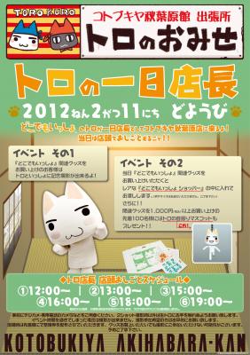 秋葉原にてキャラクターグッズやフィギュア・プラモデルの販売を行うコトブキヤ秋葉原館は、2012年2月11日(土)に、大人気ゲームソフト「どこでもいっしょ」のキャラクター・トロを一日店長としてお迎えするイベントを開催する。