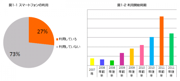 有効回答者数1,424名(男性657人、女性767人)のうち、27%がすでにスマートフォンを利用しているという結果が出ました。(図1-1)利用開始時期については、2011年前半が最多で、次に多いのは2011年後半(本調査を実施した10月まで)でした。(図1-2)利用機種は、iPhoneを上回って、Androidが1位となりました。