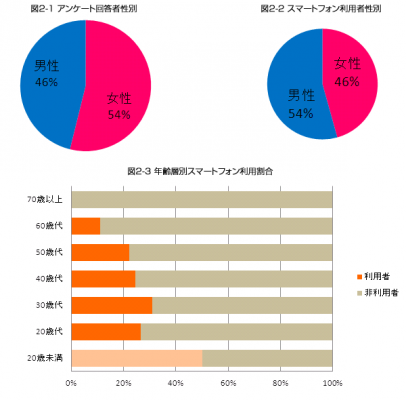 スマートフォンを利用していると回答した会員の性別は男性が207人に対して女性が174人となり、回答者の男女別でみたときのスマートフォン利用比率は男性では32%、女性では23%でした。(図2-1、図2-2)また、年齢層別では30歳代の利用比率がもっとも高く、続いて20歳代、次に40歳代となりました。(図2-3)
