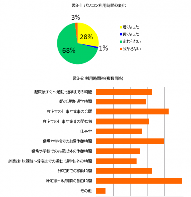 「スマートフォンを利用するようになってから、自宅のパソコンの利用時間に変化があったか?」との問いに「自宅のパソコンの利用時間が短くなった」との回答が利用者全体の28%でした。(図3-1)その理由として、「スマートフォンはパソコンよりも身近で、手軽に利用できる」「パソコンで行っていたメールのチェックやインターネットでの情報収集、ソーシャルメディアの閲覧と投稿などがスマートフォンでできるようになった」などが挙げられました。また、平日の利用時間帯は「帰宅後~就寝前の自由時間」に続いて、「仕事や家事の合間」「お昼休憩時間」の3つが全体の40%を占めました。(図3-2)
