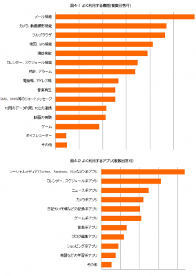 「よく利用する機能」を問う質問(複数回答)に対しては「メール機能」「カメラ・動画撮影機能」「フルブラウザ」「地図・GPS機能」の順で回答数が多く、いずれも「通話機能」を上回りました。(図4-1)また、「よく利用するアプリ」(複数回答)については、「ソーシャルメディア系」が最も多く、「カレンダー・スケジュール系」「ニュース系」の順で回答数が多い結果となりました。(図4-2)