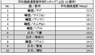平均接続速度の世界都市別ランキングでは、上位100都市の内、日本が57都市、オーストラリア及び香港がそれぞれ1都市、韓国の6都市がランクインし、大多数(65都市)をアジアの都市が占めました。