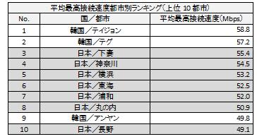 平均最高接続速度の世界都市別ランキングでは、上位100都市の内、日本が59都市、オーストラリア及び香港がそれぞれ1都市、韓国が6都市ランクインし、大多数(67都市)をアジアの都市が占めました。また、トップ10ランキングでは、茨城県下妻の3位(55.4Mbps)を筆頭に、日本の7都市がランクインしています。