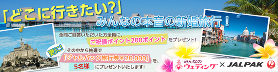 【特典】:全問回答いただいた方の中から抽選で、海外旅行で使えるジャルパック旅行券20,000円分を5名様に、全問回答いただいた皆様全員に、みんなのウェディング「ご祝儀ポイント」200ポイントを謝礼として付与いたします。