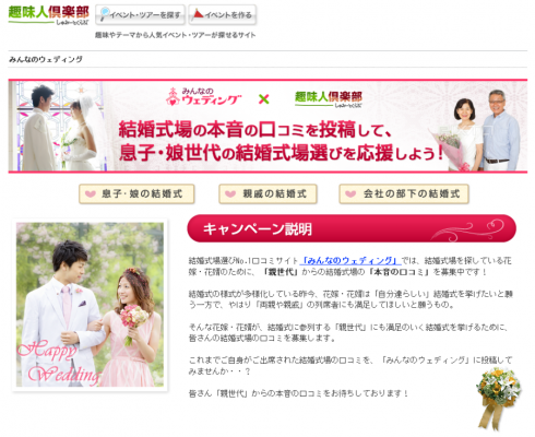 結婚式場選びNo.1口コミサイト「みんなのウェディング」※( http://www.mwed.jp/ )を運営する株式会社みんなのウェディング(本社:東京都中央区 代表取締役:飯尾慶介)は、日本最大規模のPVを誇る中高年向け趣味交流SNSサイト「趣味人倶楽部(しゅみーとくらぶ)」( http://smcb.jp/ )を運営する、株式会社ディー・エヌ・エー(本社:東京都渋谷区 代表取締役社長:守安功)と共同で、親世代からの結婚式場「本音の口コミ」を募集するキャンペーンを行います。