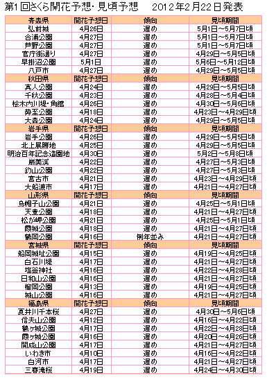 予想項目: 東北さくら名所と全国主要都市の開花予想・見頃予想