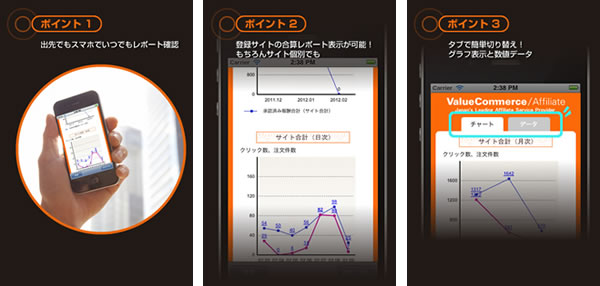 「VC/レポート」は、バリューコマースのアフィリエイトサービスにてサイト単位でしか確認できなかったクリック数、注文件数などのレポートを、ログインID単位で複数登録サイトを合計してスマートフォン用アプリで確認できるものです。