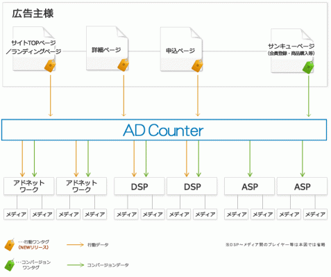 広告主様は、『AD Counterコンバージョンワンタグ』に加え、『AD Counter行動ワンタグ』を導入することで、一度訪問したものの会員登録まで至らなかったユーザへのリターゲティングや、商品購買者や会員退会者への限定ターゲティングなど、多彩なターゲティングメニューを複数DSP/アドネットワークで一括実施できるようになりました。