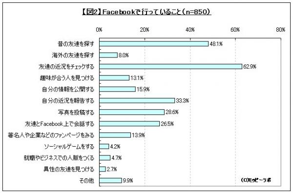 株式会社セレス(本社:東京都港区、代表取締役:都木聡)が運営するモッピーラボで、2012年2月21日に自社アンケートモニターにてスマートフォンリサーチ「Facebook利用動向調査」を実施致しました。スマートフォンのみで調査を行い、調査対象は全国のFacebookを利用している男女で、有効回答数は850サンプルです。