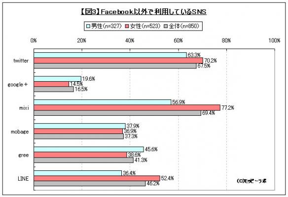 図表参照:【図3】Facebook以外で利用しているSNS(性別でクロス集計)