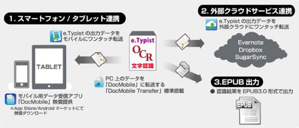 クラウドサービスとの連携では、出力ファイルをインターネット経由で外部のクラウドサービス(Evernote/Dropbox/SugarSync)へダイレクトに転送することができます。e.Typistのワンタッチ転送機能を使用しますので、画像の読み込みから出力までを一括で処理することが可能です。転送するファイルの種類もテキストやPDFなど、いろいろお選びいただけます。