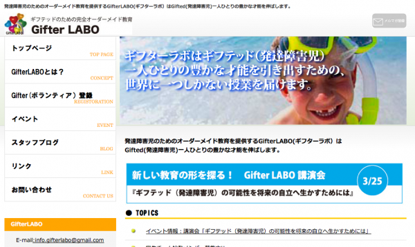 発達障害児のための個別教育支援「Gifter LABO」では、「ギフテッド(発達障害児)の可能性を将来の自立へ生かすためには」について、講演会を行います。