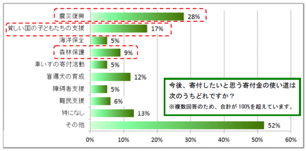 寄付したいと思う活動内容として最も多く挙げられたのは、やはり「震災復興支援(28%)」でした。続いて、「貧しい国の子どもたちの支援(17%)」「盲導犬の育成(12%)」「森林保護(9%)」と続きました。「震災復興支援」への関心は、発生から1年を迎えようとする現在も高いことが伺えます。また、当社をご利用のお客様に多い30代~40代の女性には子育て世代にあたる方も多く、子供たちへの関心の高い方が「貧しい国の子どもたちの支援」を選択しているようです。
